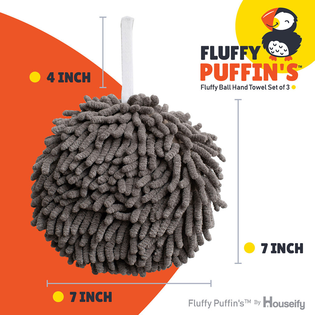 Fluffy Puffin's Fluff Ball Hand Towels, Set of Three, with Wall Hook Attachments, Grey & White Set